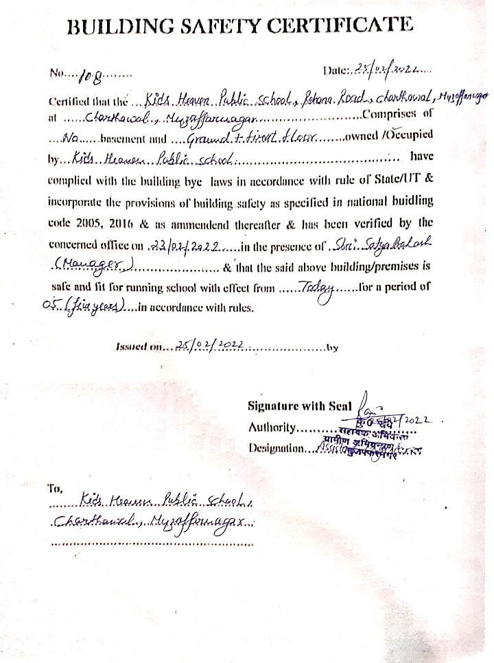 COPY OF VALID BUILDING SAFETY CERTIFICATE AS PER THE NATIONAL BUILIDING CODE |