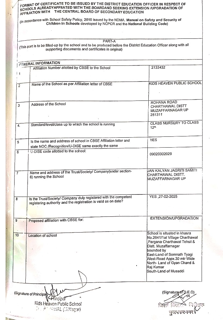 COPY OF THE DEO CERTIFICATE SUBMITTED BY THE SCHOOL FOR AFFILIATION/UPGRADATION/EXTENSION OF AFFILIATIONOR SELF CERTIFICATION BY SCHOOL |
